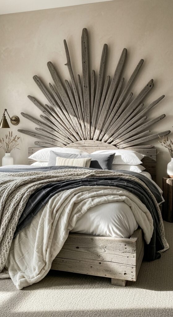 Sustainability meets high design. This bed uses salvaged wood that has been weathered by time, featuring silver-grey patinas and deep textures. The headboard is shaped into a gentle, oversized arch that mimics the rising sun. Because every piece of reclaimed wood is different, your bed is a one-of-a-kind masterpiece. It adds a layer of “story” to your home, proving that luxury doesn’t have to be brand new; it can be beautifully recycled.