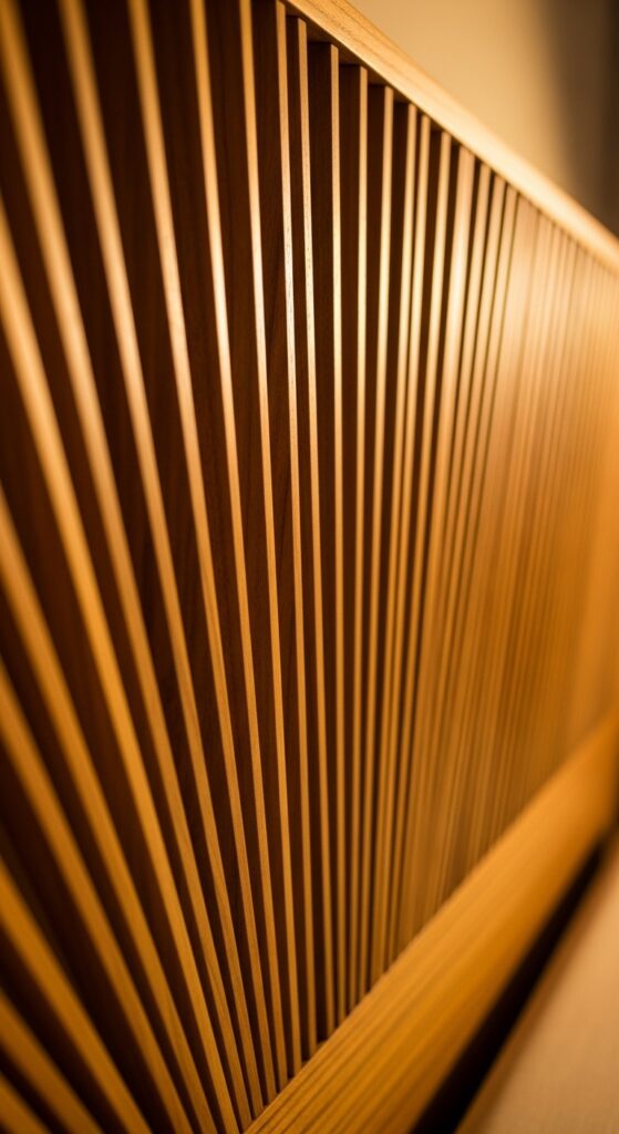 This design utilizes vertical “ribs” of teak wood arranged in a sunburst pattern across the headboard. The organic element comes from the varying heights and slightly irregular spacing of the slats, mimicking a forest treeline. Teak is naturally oily and durable, giving it a soft glow even without heavy varnishes. This texture creates a beautiful play of light and shadow when placed under pendant lighting, adding depth to your bedroom walls.