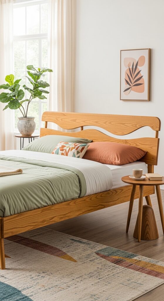 Merging the tapered legs of the 1950s with a modern curved frame, this design is for the vintage lover. The wood is typically honey-toned cherry or teak, with a headboard that features “cut-outs” or organic voids. These openings keep the bed from looking too heavy. It’s a versatile design that fits into both a modern apartment and a suburban home, offering a nostalgic yet fresh look that balances geometry with nature.