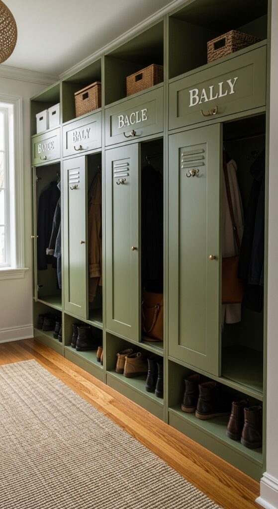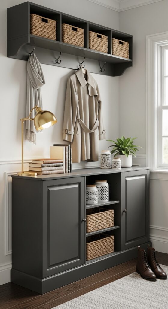The IKEA Pax system is the ultimate “canvas” for the best IKEA mudroom ideas. By using deep Pax frames without doors, you create custom-looking lockers. Imagine floor-to-ceiling cabinetry painted in a moody charcoal or soft sage green. You can add crown molding to the top to bridge the gap between the wardrobe and your ceiling, making it look like expensive custom millwork. Inside, use the Komplement drawers for hidden shoe storage and sturdy brass hooks for heavy coats. This setup is a Pinterest favorite because it hides the visual noise while providing massive storage capacity for large families.