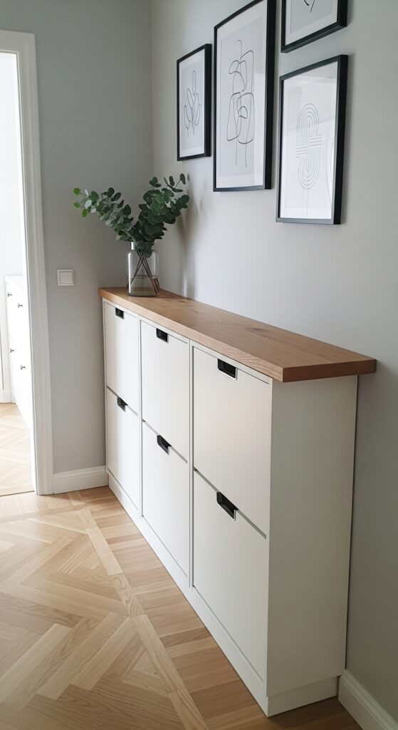 Narrow hallways often suffer from “shoe creep,” where footwear spills into the walking path. The Bissa shoe cabinet is the perfect antidote. These cabinets are incredibly slim, leaning against the wall and taking up minimal floor space. Imagine a row of three Bissa cabinets painted to match your wall color, topped with a single long piece of stained oak wood. This “floating sideboard” look is perfect for modern homes. It keeps dozens of shoes tucked away in flip-out drawers, maintaining a clean, minimalist aesthetic that looks amazing in photos.