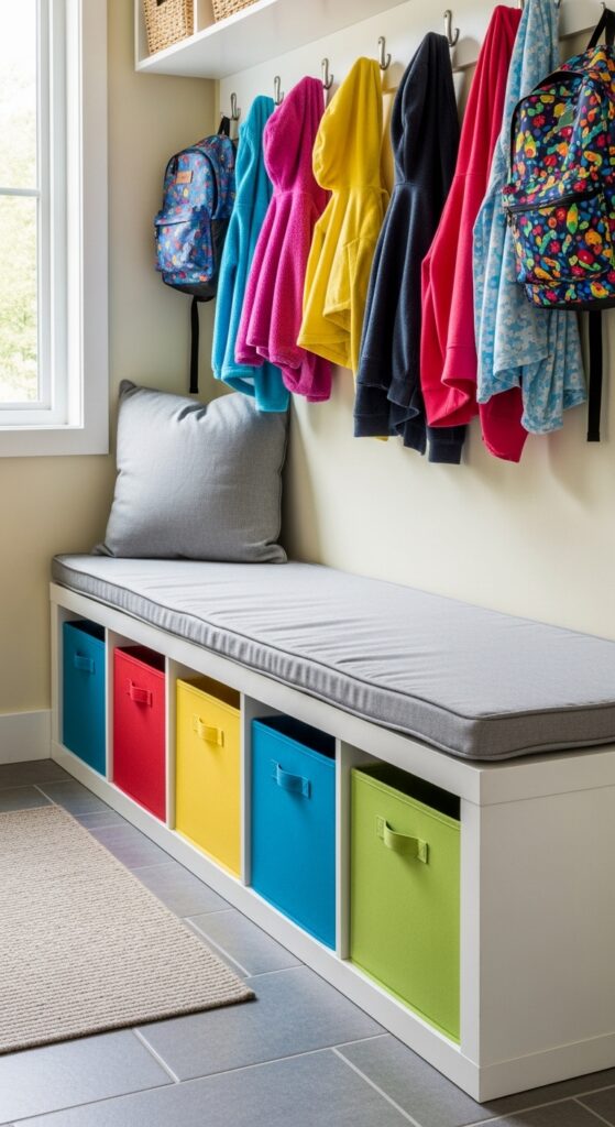 For homes with little ones, the Kallax unit is a lifesaver. By turning a 1×4 Kallax unit on its side, you create a low-profile bench perfectly height-matched for children. Use the square cubbies for individual fabric bins—one for each child’s shoes and toys. This empowers kids to manage their own gear. Imagine a soft, custom-sewn cushion on top in a playful print. This setup works beautifully alongside IKEA kids playroom ideas, extending that sense of organized play right to the front door. It’s colorful, sturdy, and incredibly affordable.