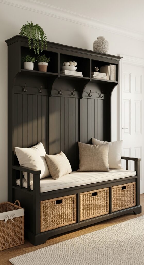 If you love a classic, timeless look, the Hemnes series is unbeatable. Combine the Hemnes storage bench with the Hemnes wall-mounted bridge shelf. This creates a cozy “nook” where you can sit comfortably to pull on your boots. Picture a dark wood finish against a crisp white wall, decorated with textured wicker baskets in the cubbies. It’s practical because it offers both seating and overhead storage for hats and scarves. To elevate this look, consider adding some wall molding ideas behind the bench to give the space an architectural, high-end feel.