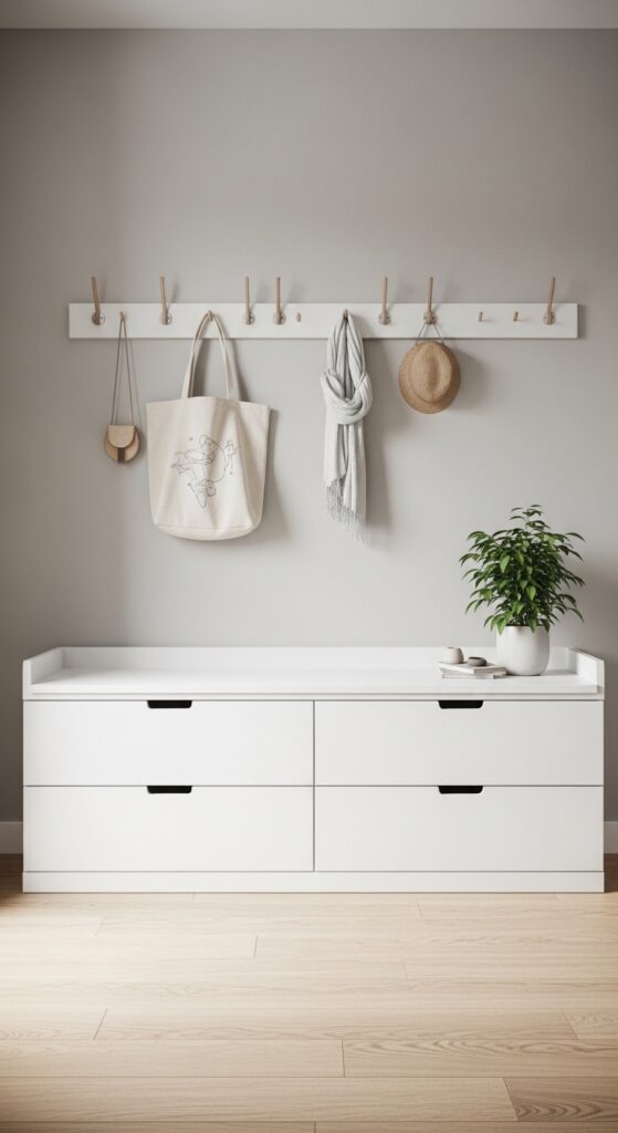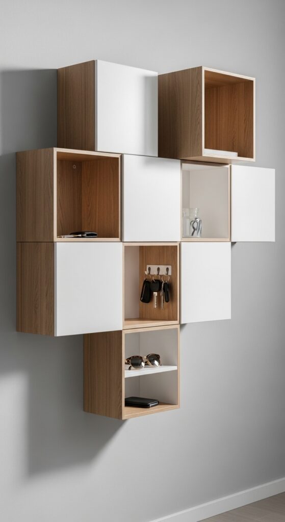 The Eket series allows you to play with geometry. By mounting different sized Eket cubes on the wall in a staggered pattern, you create a functional piece of art. Each cube can serve a purpose: one for the dog’s leash, one for mail, and one for sunglasses. Imagine a mix of wood-finish and white cubes against a dark accent wall. This is a brilliant solution for entryways with zero floor space. It keeps the floor clear, making the area much easier to clean and giving it a light, floating appearance.