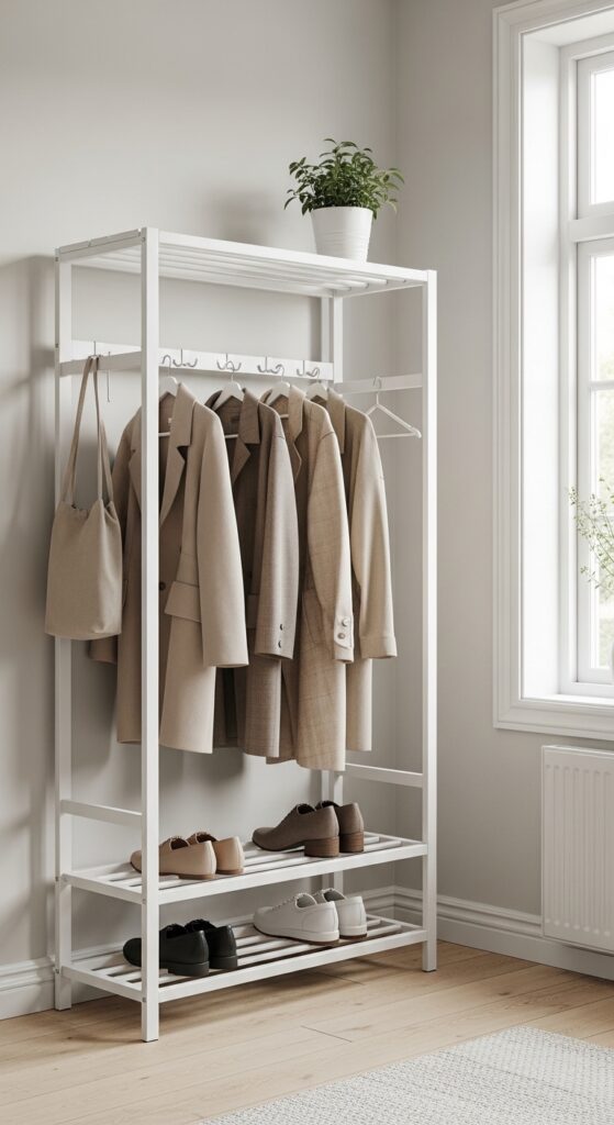 For those who prefer an industrial or modern look, the Boaxel system is a dream. It’s a wall-mounted, fully adjustable system that allows you to mix and match mesh baskets, clothes rails, and wooden shelves. Imagine a clean, white Boaxel setup in a laundry-room-turned-mudroom. It feels light and airy because it doesn’t have heavy side panels. It’s highly practical for drying wet umbrellas or airing out damp coats. The visual appeal lies in its clean lines and the ability to see exactly where everything is at a glance.