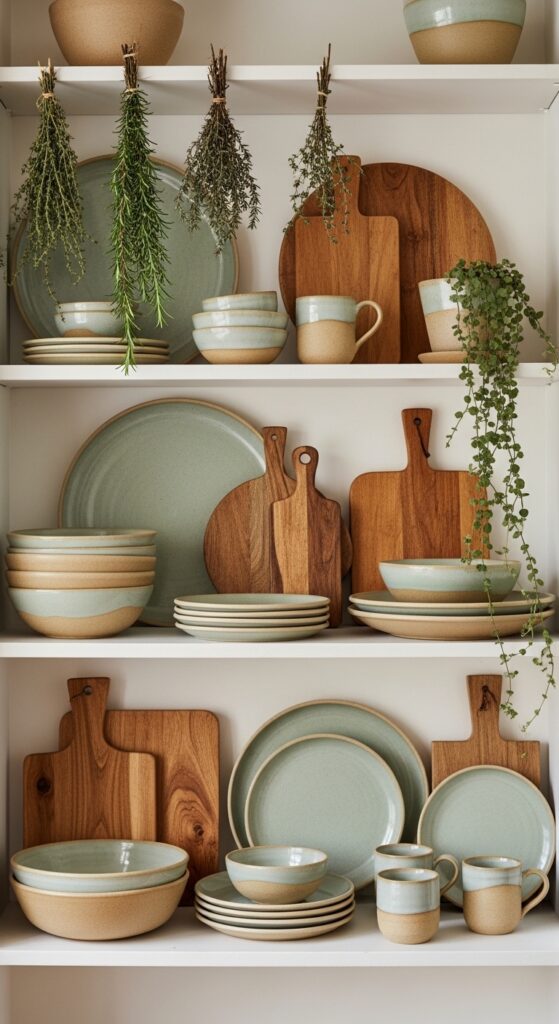 Replace upper kitchen cabinets with open shelving and style them with earthenware, handthrown pottery, and natural materials for a kitchen that feels warm, personal, and deeply earthy. Display your everyday dishes — especially if they are ceramic or stoneware in earthy glazes — rather than hiding them away. Wooden cutting boards leaned casually against the wall, a row of olive oil bottles, a collection of hand-painted mugs, a terracotta oil drizzler: these everyday objects become art when thoughtfully arranged on open shelves. Add a small trailing plant like pothos or string-of-pearls for softness. This style of kitchen is wildly popular on Pinterest because it photographs beautifully and feels aspirational yet achievable — the kind of kitchen where you genuinely want to spend time cooking and gathering.