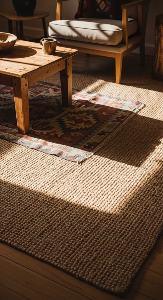 A natural fiber rug is foundational to the earthy cottage aesthetic. Jute and sisal rugs in their natural undyed state bring instant warmth and texture to any floor — wood, tile, or concrete. They are durable, sustainable, and age beautifully, developing a soft patina over time. Layer a smaller, softer rug on top — a vintage kilim, a worn Persian, or a simple cotton flatweave — for a casual, collected look that is very cottage in spirit. Jute works particularly well in sitting rooms and dining areas. Sisal, being slightly harder-wearing, suits hallways and kitchen areas. Both materials photograph with beautiful texture and depth, making them perennial Pinterest favorites. Avoid placing them in wet or very humid environments, as natural fibers can be prone to mold if consistently damp.