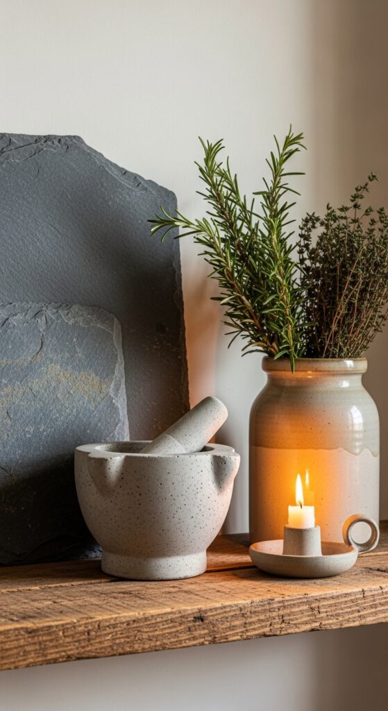 Natural stone and concrete add a grounding, mineral quality to earthy cottage decor that balances the softer textures of linen and wood. Think a concrete candle holder on a windowsill, a slate cheese board on a kitchen counter, or a smooth river stone used as a paperweight or doorstop. You don’t need grand architectural stone features to use this material — small accessories are enough to bring that cool, ancient-earth energy into a room. Rough-hewn marble or travertine coasters add a luxurious natural element to a coffee table. Tumbled stone tiles as a small bathroom feature wall create a spa-like effect. The key is to use stone raw and unpolished — honed or rough finishes read as natural, while high gloss feels more contemporary and less cottage.