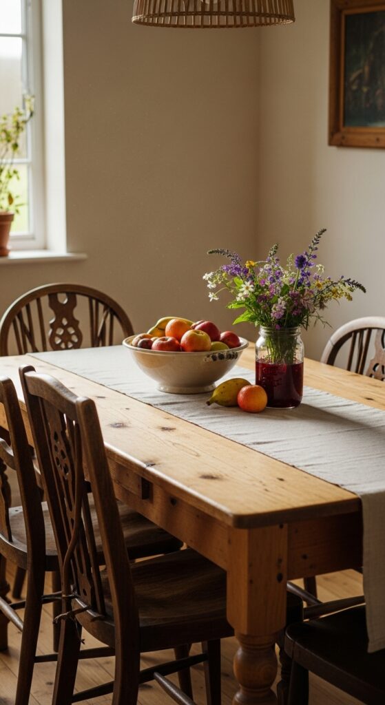 Nothing says earthy cottage home decor like furniture with a past. A scrubbed pine farmhouse table, a Victorian chest of drawers with its original paint, a battered leather armchair with cracked patina — these pieces bring soul to a space that new furniture simply cannot replicate. Shop auction houses, estate sales, car boot fairs, and charity shops. Focus on solid wood pieces — oak, pine, walnut, elm — over flatpack or veneer. Don’t over-restore them: a little wobble in a chair leg, original wear on a table top, old paint drips on a chest — these are proof of life, not faults. Mix wood tones freely. The cottage aesthetic actively resists matchy-matchy furniture suites, preferring instead the layered, personal quality of pieces gathered across different eras and sources.