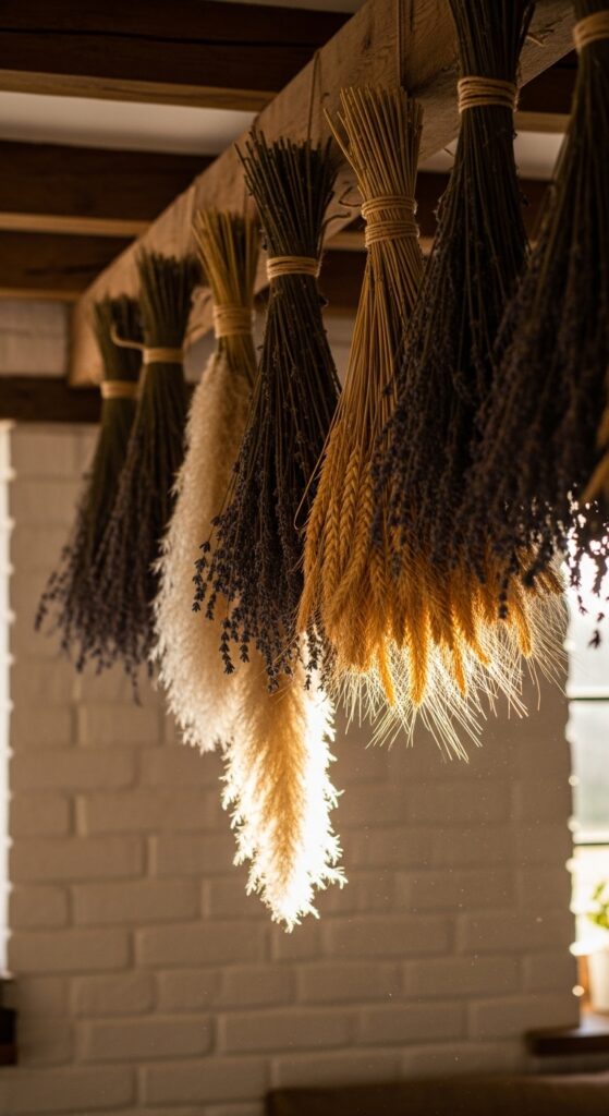 Dried flowers have had a massive revival — and for good reason. They are low-maintenance, long-lasting, and achingly beautiful. Hang bunches of dried lavender, pampas grass, wheat sheaves, or eucalyptus upside down from a ceiling beam or curtain rod. Display dried hydrangeas, roses, or amaranth in a stoneware vase for a still-life arrangement that looks like a Dutch oil painting. The earthy cottage aesthetic particularly loves neutral dried botanicals — creams, taupes, soft greens, and blush tones that complement the palette without overwhelming it. Forage your own from hedgerows and gardens in late summer, or buy from small-batch botanical sellers. The key is abundance: don’t be shy with quantity. Big, generous bunches look dramatic and luxurious.