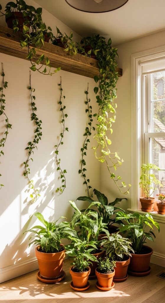 Plants are non-negotiable in earthy cottage home decor — but not in a minimalist, single-pot way. The cottage approach is generous and slightly wild. Train climbing plants up walls using thin wire or wooden trellises: ivy, philodendron, pothos, or hoya all work beautifully indoors. Let them cascade from high shelves or tumble from hanging baskets. Cluster plants in corners and on windowsills until the room has that lush, slightly overgrown quality of a Victorian glasshouse. Choose terracotta or ceramic pots to keep the earthy palette consistent. The visual effect of green trailing against a limewashed wall or above a reclaimed wood shelf is one of the most pinnable images in the cottage aesthetic — it encapsulates that sense of nature being welcomed inside rather than kept at arm’s length.