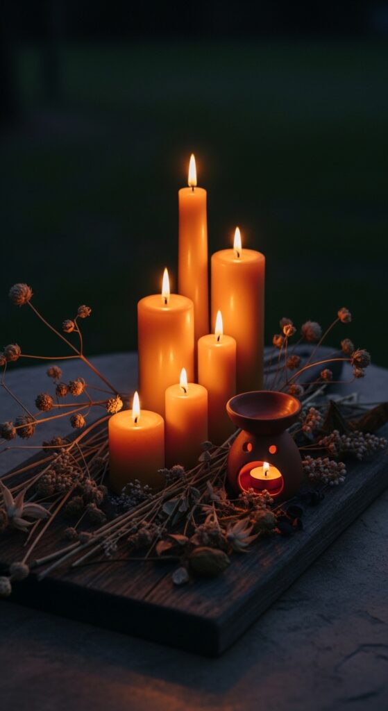 Earthy cottage home decor engages all the senses — not just sight. Beeswax candles are the olfactory hallmark of cottage living: they smell naturally of honey and warm wax, burn cleaner than paraffin, and glow with a warm amber light that flatters any room. Display them in collections of different heights — in simple iron holders, on wooden boards, or directly on heat-safe surfaces. Clay or terracotta oil diffusers add a complementary sensory layer: fill them with cedarwood, sandalwood, frankincense, or eucalyptus oils for a home that smells like a forest clearing. The visual of candles and natural ceramics together is a powerful Pinterest image — warm, intimate, and evocative. Avoid overly perfumed synthetic candles; the earthy cottage ethos is about natural, honest scents that feel connected to the land.