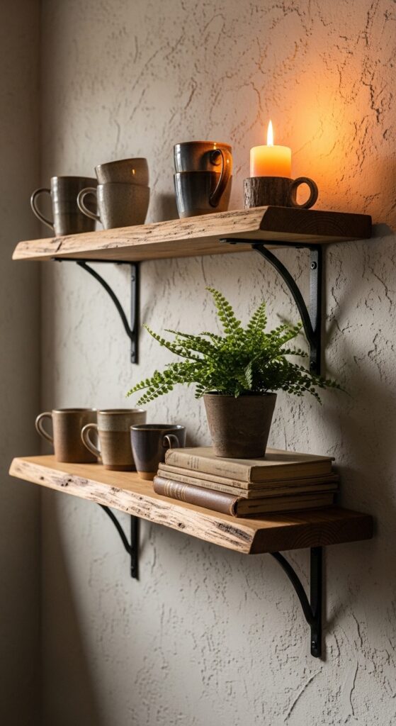 Reclaimed wood shelves are the backbone of earthy cottage home decor. Each piece of aged timber tells a story — knots, grain variations, and natural edges are features, not flaws. Install them in the kitchen to display earthenware jars and dried herbs, or in the living room to hold a curated mix of old books, candles, and trailing plants. The key is restraint: don’t over-style. A shelf that looks like it was arranged casually, with a few purposeful gaps, always looks more authentically cottage than one crammed with objects. Choose brackets in blackened steel or hand-forged iron for a grounding contrast that anchors the natural wood without competing with it. Sand lightly and seal with beeswax rather than varnish for the most natural finish.