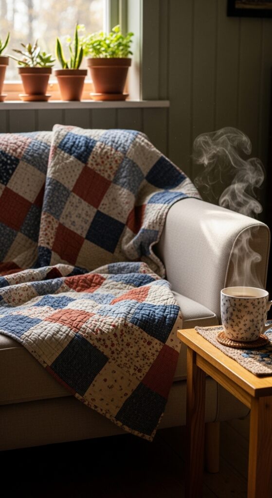 A handmade quilt draped over a sofa or folded at the foot of a bed is one of the most powerful earthy cottage styling tools you have. Quilts carry warmth in every sense — visual, physical, and emotional. Look for patchwork quilts in natural cotton or linen with muted, earthy palettes: indigo, terracotta, cream, sage, and ochre. Vintage quilts from markets and charity shops are ideal — they have a softness and patina that new quilts can’t replicate. Layer multiple textures: a rough-weave throw over a smoother quilt, a velvet cushion on a linen sofa. This layering of textiles is a hallmark of cottage style and creates that “collected over a lifetime” feeling that makes earthy cottage homes so emotionally resonant. Don’t fold them too neatly — casual draping is the look.