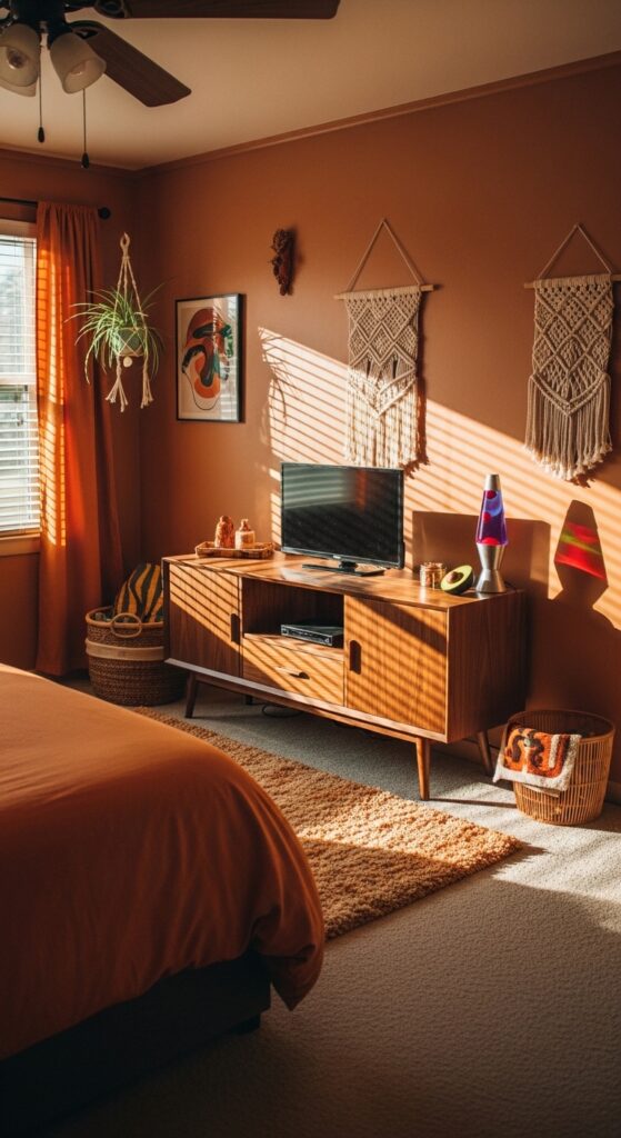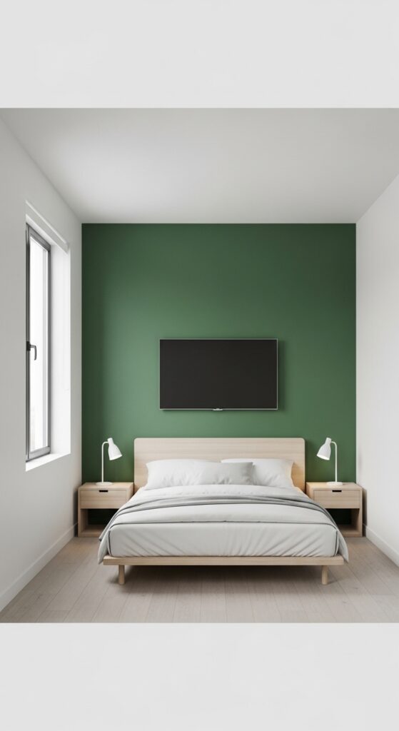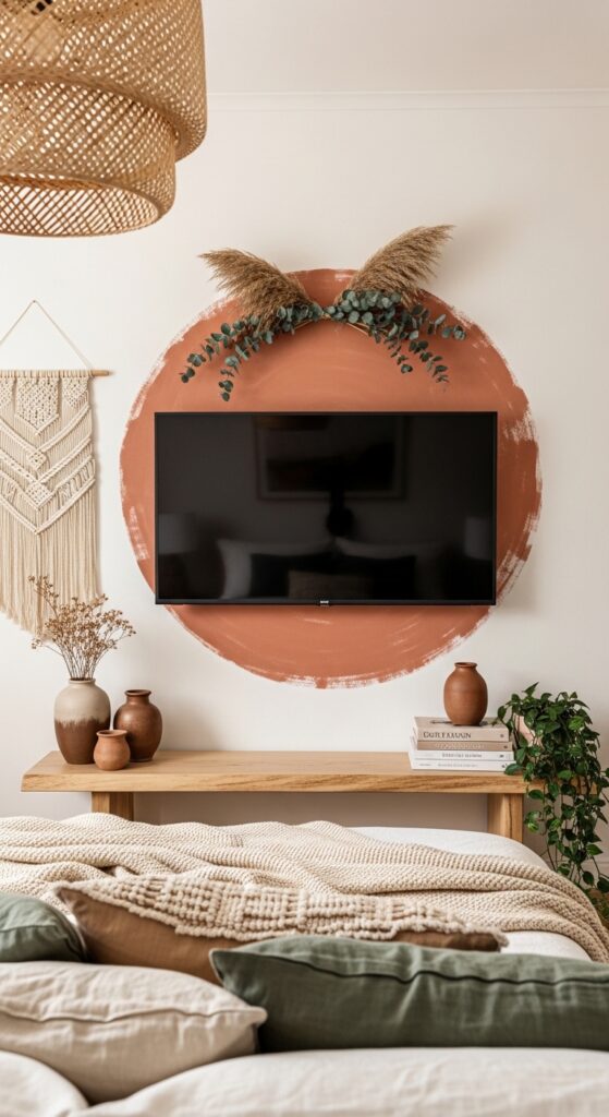 For a creative and artistic soul, use painter’s tape to create large geometric shapes on the TV wall. A large circle or an offset rectangle in a contrasting color can frame the TV like a piece of modern art. This tv wall design simple DIY project costs almost nothing but has a massive visual impact. It’s a great way to express your personality. Use soft, muted tones like terracotta, sage green, or dusty rose to keep the bedroom feeling peaceful and sleep-ready.