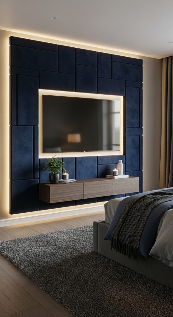 Bedrooms are all about “softness.” Why not use fabric panels for your tv wall design ideas? Velvet or linen-wrapped acoustic panels not only look incredibly cozy but also improve the sound quality of your TV. They absorb echoes, making the audio crisp and the room quiet. Choose a deep navy or charcoal grey fabric to create a “cinema” feel. This is a tactile design that invites you to touch it and makes the bedroom feel like a padded, private sanctuary away from the world.