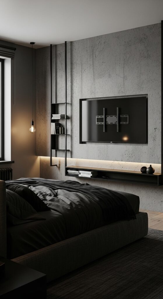 For a loft-style or masculine master bedroom, a faux-concrete plaster finish is an incredible tv wall design. The raw, grey texture provides a neutral backdrop that makes the colors on your TV screen appear more vibrant. It’s a bold choice that works well with black metal accents and Edison-bulb lighting. This look is highly “Instagrammable” and works best when the TV is wall-mounted with no furniture underneath, emphasizing the “less is more” industrial philosophy that is so popular in modern urban homes.