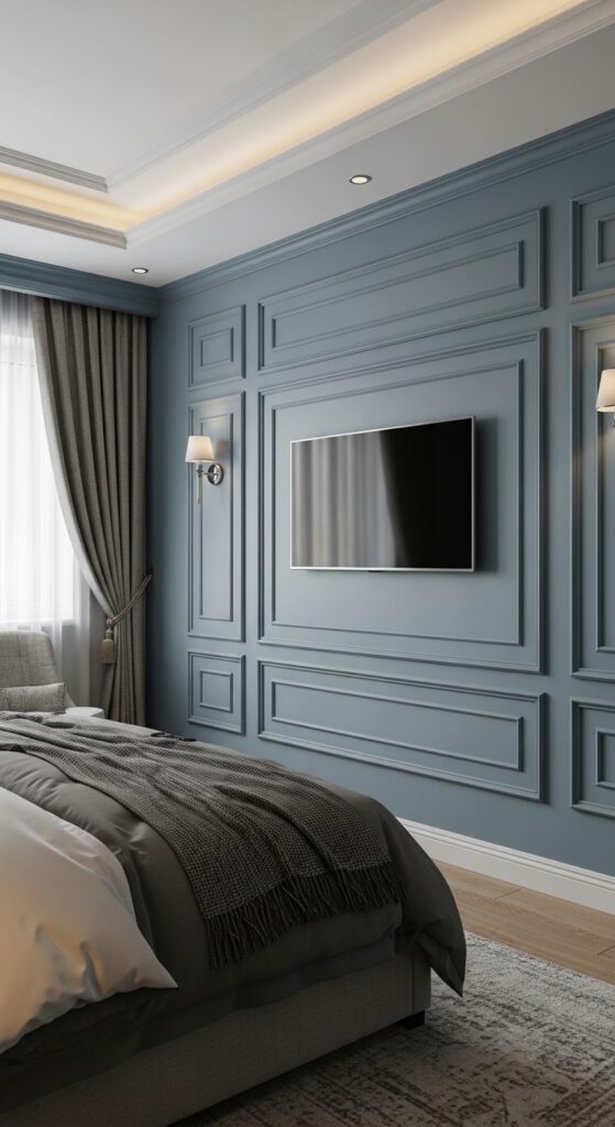 If your bedroom has a traditional or French-provincial vibe, look into 16 wall molding ideas. Framing your TV with picture frame molding adds an architectural depth that paint alone cannot achieve. Paint the molding the same color as the wall for a subtle, sophisticated look, or use a slightly darker shade to make the TV area pop. This design turns the TV wall into a permanent part of the room’s architecture rather than an afterthought, blending modern tech with classic heritage.