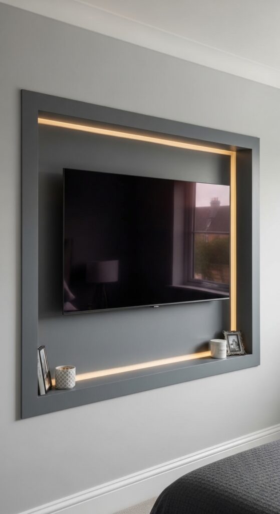 Creating a “niche” or a hollowed-out section in the wall for your TV is a top-tier modern tv wall design. By setting the TV back into the wall, it sits flush with the surface, preventing it from sticking out into your walking path. Line the inside of the niche with a contrasting color or wallpaper. Add “Cove Lighting” (LED strips) around the inner edge. This creates a soft halo effect that acts as a nightlight and reduces eye strain while watching TV in a dark bedroom.