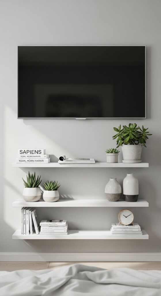 Functionality meets style with floating shelves. This tv wall design ideas involves installing long, horizontal shelves that extend past the TV. It’s a great way to display personal photos, books, or small plants. By keeping the shelves “floating” (without visible brackets), the wall stays airy and light. This is ideal for smaller master bedrooms where floor space is limited. Use a matte finish for the shelves to avoid glare on the screen, ensuring your late-night movie sessions are comfortable and glare-free.