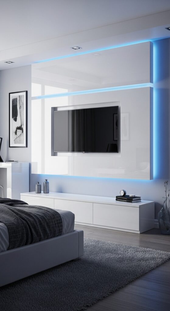 For a sleek, ultra-modern look, consider high-gloss lacquer panels. These reflect light and can make a small bedroom feel much larger. In a white or light grey finish, a glossy modern tv wall design looks like glass. It is incredibly easy to clean and gives the room a polished, futuristic aesthetic. When paired with hidden LED strips at the top and bottom, the entire wall appears to be floating in a sea of light, which is perfect for a clean, tech-forward home.