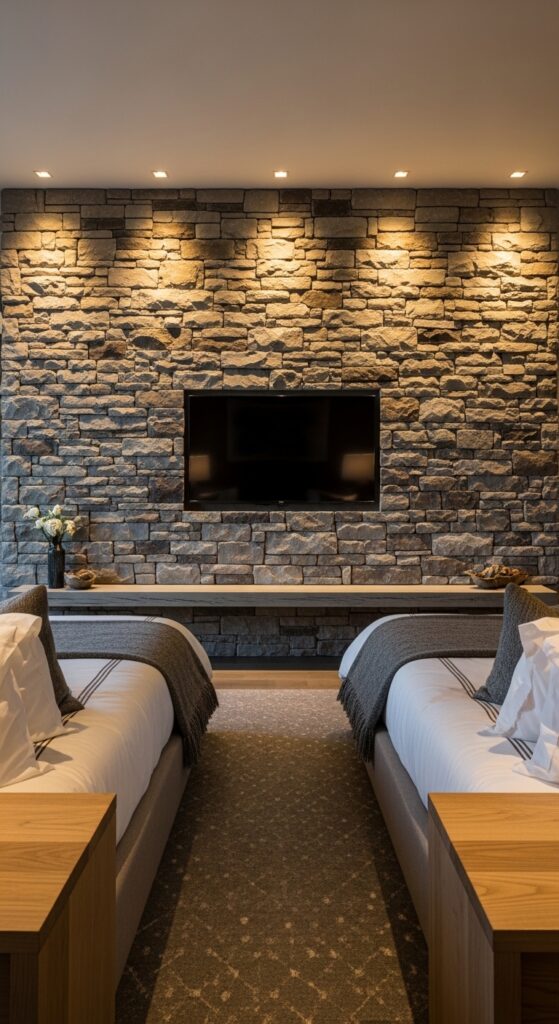 Natural stone brings an earthy, grounded feel to a master bedroom. Using ledger stone panels (small strips of stacked stone) creates a rugged, high-contrast tv wall design. The uneven surface of the stone catches light from different angles, creating a dramatic effect. It’s a very popular look for 15 tv wall design ideas that are being adapted from living rooms into bedrooms. It feels permanent, sturdy, and adds a “resort” vibe to your personal sleeping quarters.