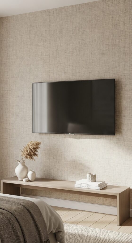 Wallpaper has made a massive comeback in tv wall design. For a bedroom, look for “grasscloth” or “embossed” wallpapers that have a physical texture you can see from a distance. A subtle metallic thread in the wallpaper can catch the light beautifully. Since the TV wall is usually the one you face while in bed, a beautiful pattern can act as a mural. Just ensure the pattern isn’t too busy, as it might distract you from the screen while watching your favorite shows.