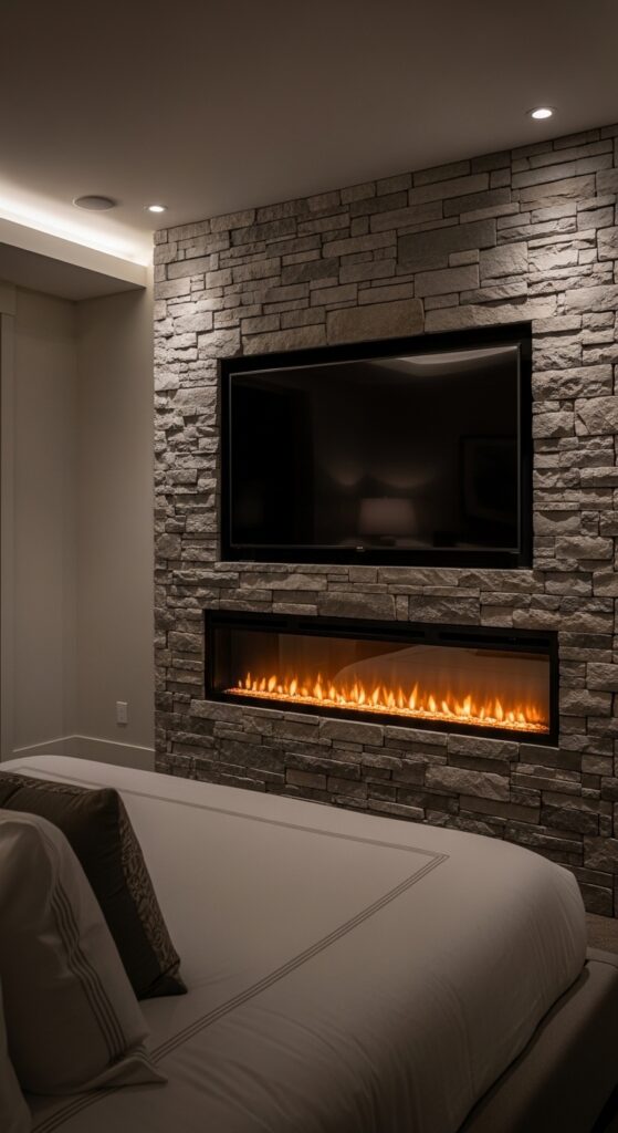 Nothing says “master suite luxury” like a fireplace under the TV. This modern luxury tv wall design uses an electric linear fireplace at the base with the TV mounted safely above. It provides warmth and a flickering glow that enhances the bedroom’s ambiance. Ensure there is a mantel or a heat shield between them. This setup is the ultimate Pinterest dream, combining the two most relaxing elements—fire and film—into one beautiful, vertical stack that serves as the room’s main feature.