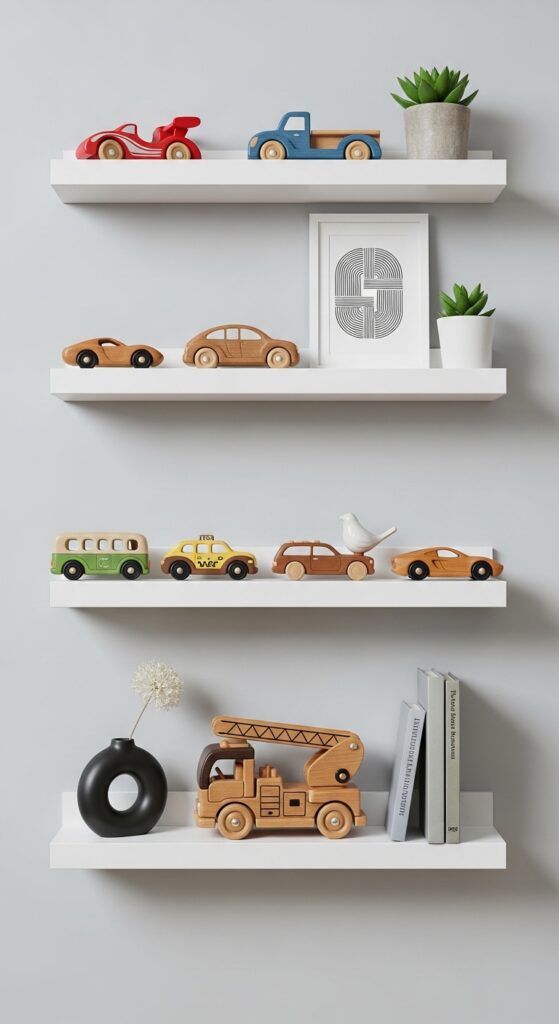 If your child has a collection of beautiful toy cars, figurines, or “aesthetic” wooden toys, don’t hide them in a bin. Use Mosslanda picture ledges to create a “floating” display. These thin shelves have a little groove that prevents items from sliding off. It’s a great way to use the space above a bed or desk to add personality to the room without adding bulk.