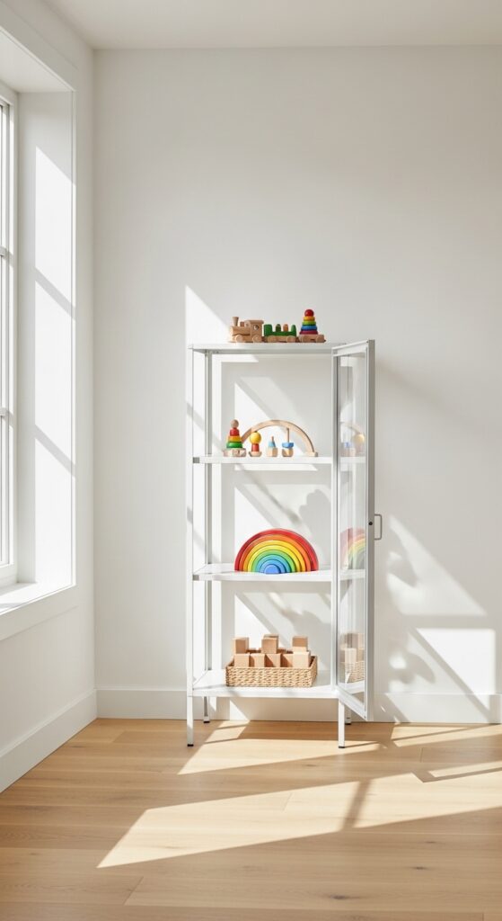 Toy rotation is a secret weapon for parents. Instead of having all toys out at once, use the slim Baggebo metal shelves to display just a few items. When kids have fewer choices, they play more deeply. The open metal mesh look is very modern and doesn’t “block” the light, keeping the playroom feeling airy and bright.