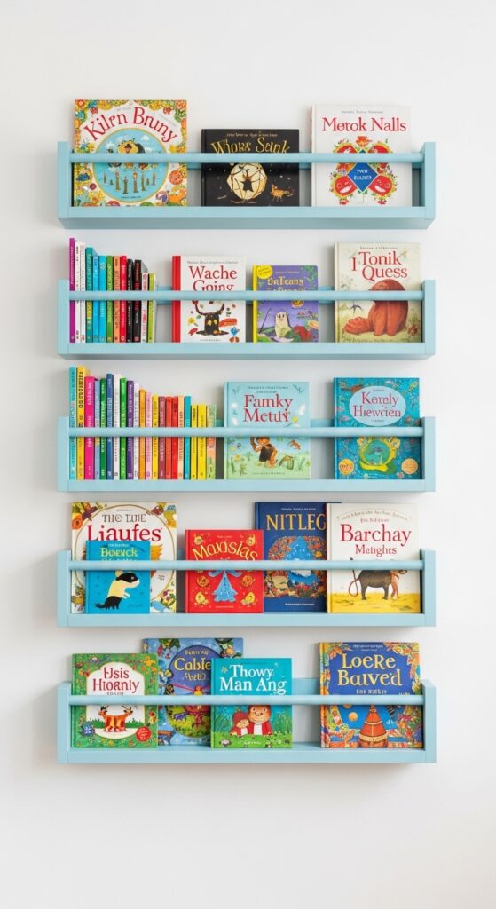 Don’t use floor space for a bulky bookshelf. The Bekväm spice racks are famous in the IKEA hacking world for a reason. When mounted on the wall, they become the perfect “front-facing” book displays. This allows children to see the covers of their books rather than just the spines, making them much more likely to grab one. Paint them in a bold accent color to make the wall “pop” or keep them natural for a clean, minimalist look.