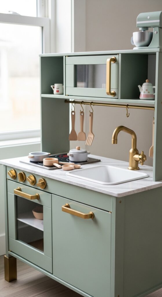 The Duktig kitchen is a staple, but the real fun is in the “glow up.” Paint the cabinets a trendy navy or forest green, swap the plastic handles for brass ones, and add a “subway tile” backsplash using peel-and-stick wallpaper. It looks so realistic that it becomes a piece of furniture you’re actually proud to have in your living room or playroom.