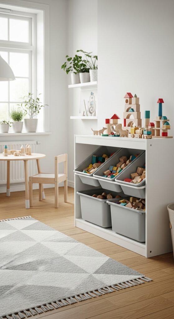 Q4: How can I hide a playroom in a living room? Use the Kallax units with “inserts” or “baskets.” When the toys are inside the baskets, the unit just looks like a stylish bookshelf. Use neutral-colored baskets like the Lustigkurre (seagrass) to match your decor.