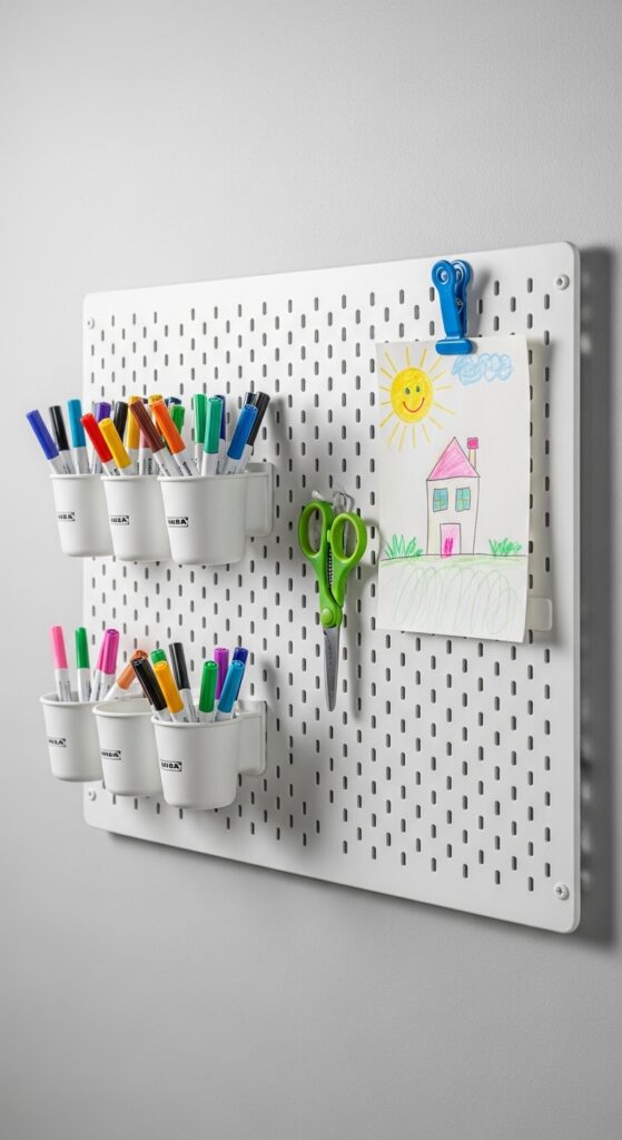 The Skådis pegboard is a vertical organizational powerhouse. Instead of taping art to the fridge, give your kids their own gallery. Use the clips and containers to hold crayons, and use the elastic cords to display their latest paintings. It turns “clutter” into “art.” Visually, the perforated holes add a modern, industrial texture to the room that looks incredible in photos.