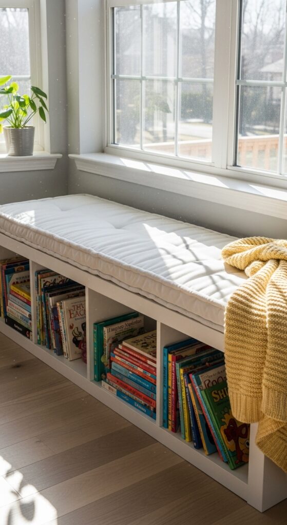 Take a 1×4 Kallax shelf, turn it on its side, and add a custom foam cushion on top. Suddenly, you have a cozy reading bench with four cubbies underneath for books. This is a brilliant way to use window space. Kids love having a “secret” spot to curl up with a story. Imagine soft velvet pillows in pastel tones sitting atop a sleek white shelf—it’s an instant “Instagrammable” corner that encourages a love for reading.