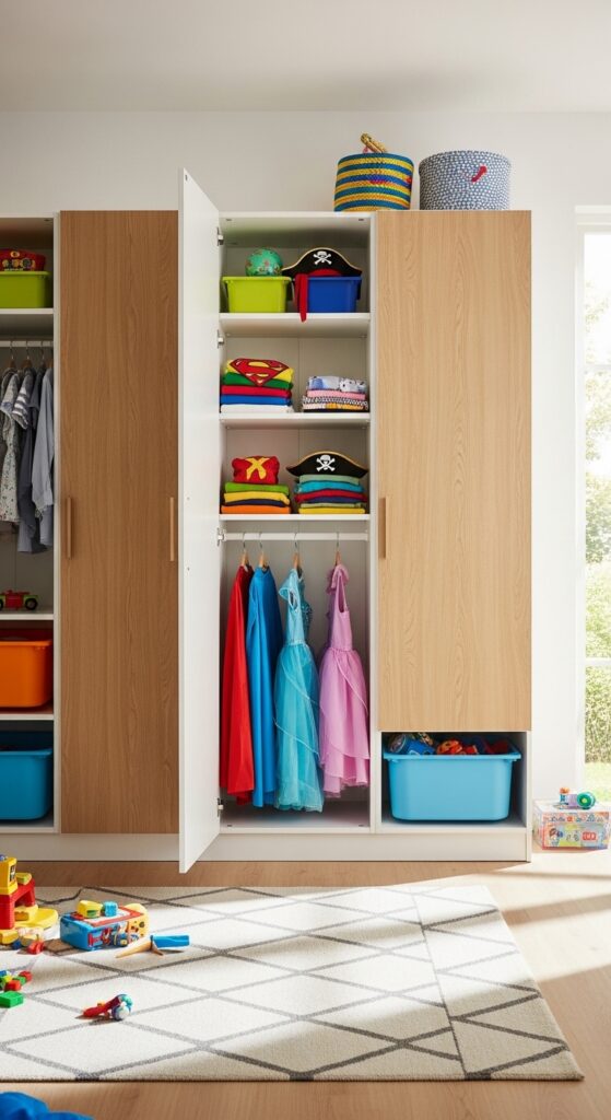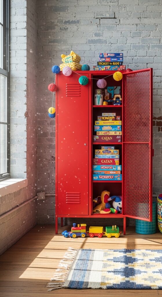 The metal IKEA PS cabinet gives a cool, “school locker” vibe that kids and teens love. It’s great for storing larger items like board games or sports equipment. The fact that it locks is a bonus for “special” toys they don’t want younger siblings to touch! The bright red or white metal adds a fun, industrial pop of color to the playroom.