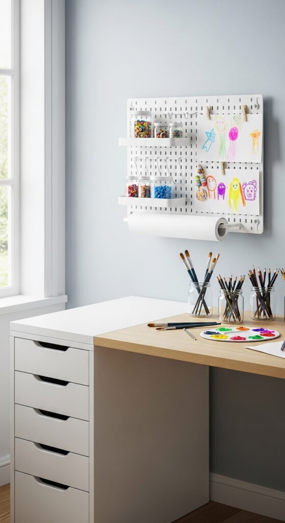 For older kids who love to draw or craft, combine an Alex drawer unit with a Malskytt tabletop. This creates a professional-looking “studio” at a fraction of the cost. The deep drawers are perfect for hiding away messy paints, glitter, and markers. Adding a Pegboard (Skådis) above the desk allows them to hang their scissors and tapes, keeping the workspace clear for big masterpieces.