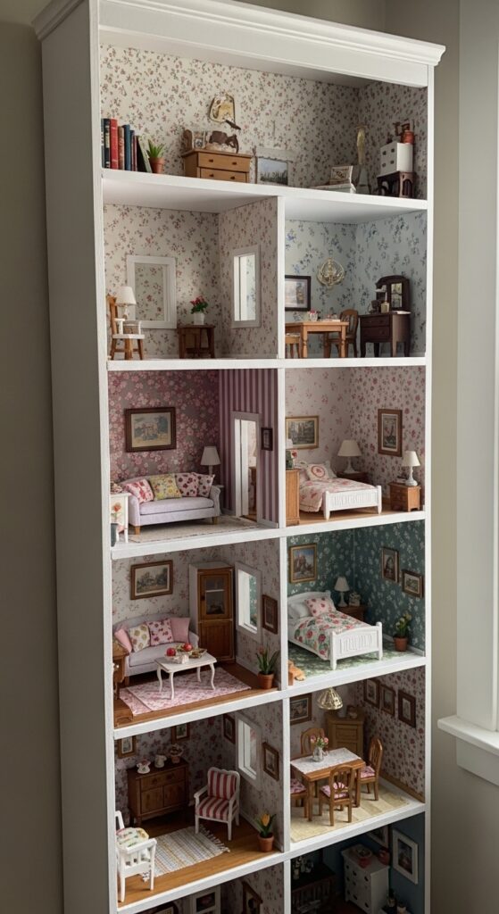 Who says the Billy bookcase is just for offices? By adding some decorative wallpaper to the back panels and a few “roof” triangular pieces on top, you can turn a slim Billy into a multi-story dollhouse or a superhero headquarters. It’s tall and narrow, making it ideal for small playrooms. It uses vertical height to create a massive play world without taking up more than a foot of floor space.