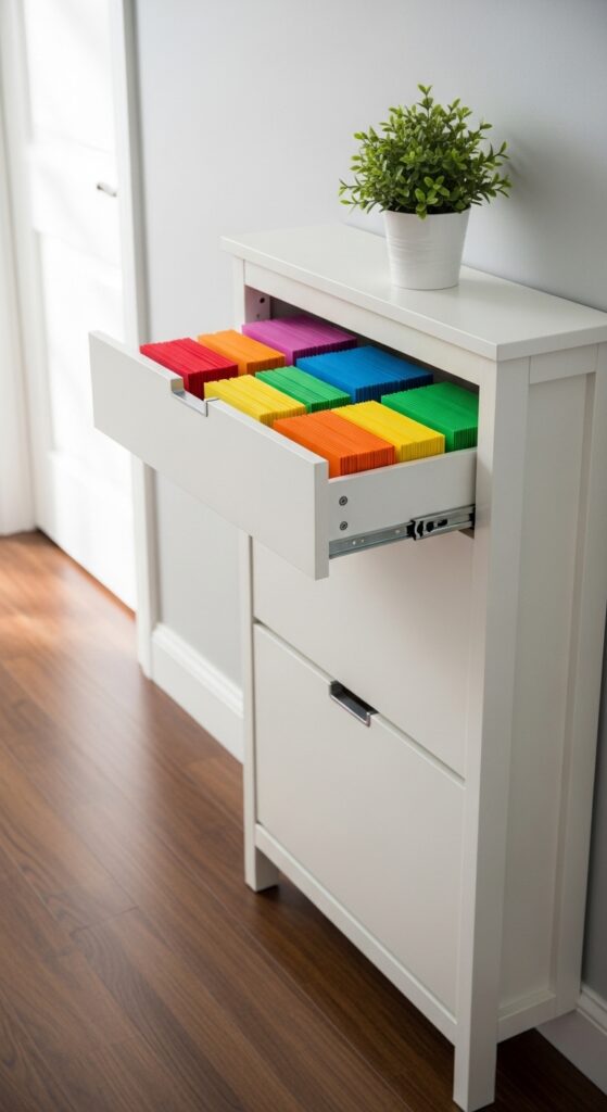 This is a “pro” hack. The Bissa or Hemnes shoe cabinets are very slim. Instead of shoes, use the tilting compartments to store construction paper, coloring books, and stickers. Because it’s so thin, you can place it behind a door or in a narrow hallway. It keeps flat items from getting crumpled and keeps the “paper trail” off the floor.