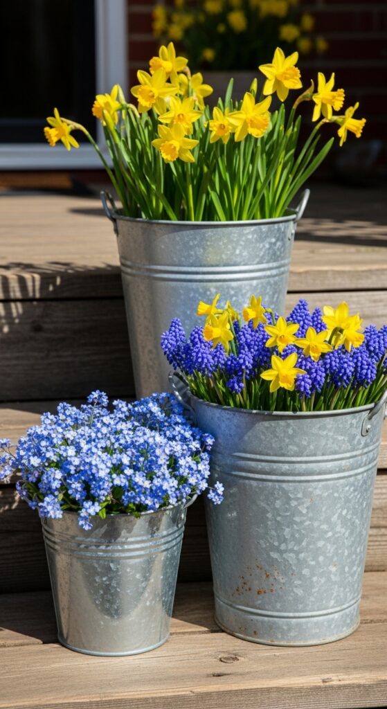 For a rustic, farmhouse-inspired look, group three galvanized metal buckets of different heights near your stairs. Fill them with a mix of spring favorites like yellow daffodils, blue muscari, and white pansies. The reflective surface of the metal adds a bright touch, while the varied heights create visual interest. This is a durable, weather-resistant decorating choice that looks better and better as the flowers bloom.