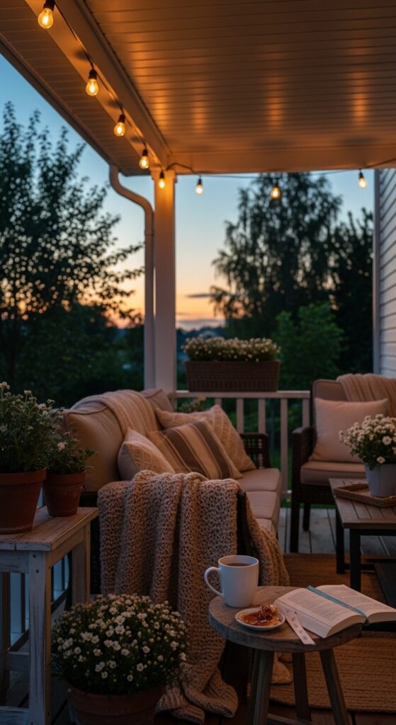 Don’t let your porch go dark at night; string up some outdoor Edison bulbs along the ceiling or railing. The warm glow creates a magical atmosphere for evening tea. It highlights your decor and makes the space feel safe and inviting after the sun goes down. This lighting adds a “resort” feel to your home that makes every evening feel like a vacation.