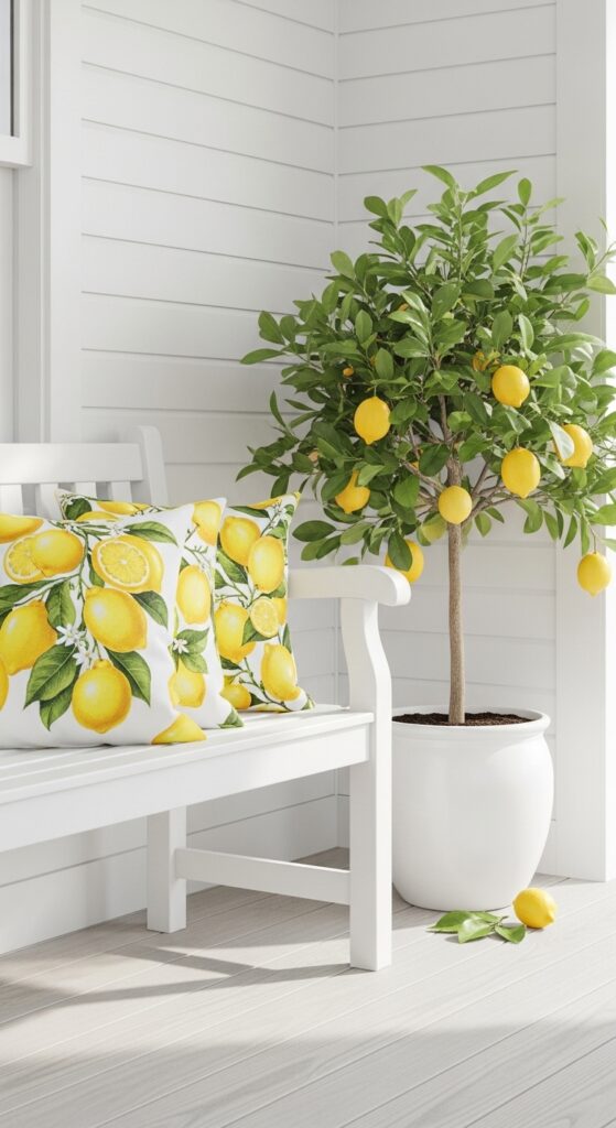 Brighten up a dark porch with the energy of lemons. Use outdoor pillows with citrus prints and place a small faux lemon tree in a bright white ceramic pot next to your door. The yellow and green palette is incredibly refreshing and screams “springtime energy.” It’s a budget-friendly way to make a big impact without needing a complete overhaul of your existing furniture.