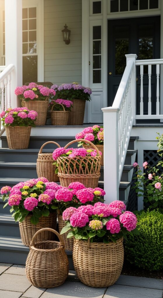 Instead of traditional pots, use woven wicker baskets to hold your spring plants along the porch steps. Line the baskets with plastic to protect them, and fill them with overflowing hydrangeas or petunias. The natural texture of the wicker adds warmth and a “boho-chic” feel to your exterior. This look is very popular for creating a “lush sanctuary” for the senses and the soul.