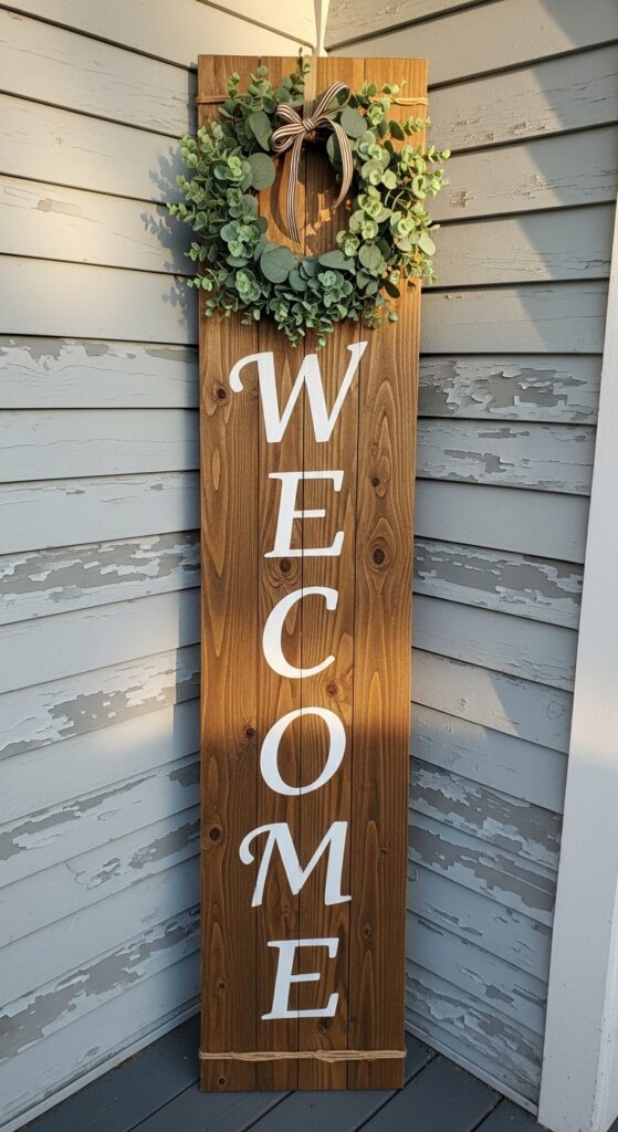 A tall, vertical wooden sign leaning against the house near the door is a staple of modern porch decor. For spring, choose one with soft pastel lettering and attach a small “nest” or a bunch of dried eucalyptus to the corner. This adds a personal touch to your entryway. It works especially well if your home has a lot of vertical space, similar to how tall units work in bookshelf styling ideas.