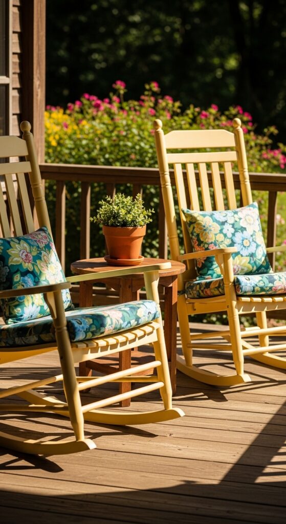 Nothing says “relaxing spring afternoon” like a classic rocking chair painted in a cheerful butter-yellow hue. Place a pair of these on your porch with some floral-patterned outdoor cushions to create an inviting seating nook. This setup pulls the first warm rays of sunshine right to your entryway. It’s a practical way to add a pop of color while providing a comfortable spot to enjoy the fresh spring air.