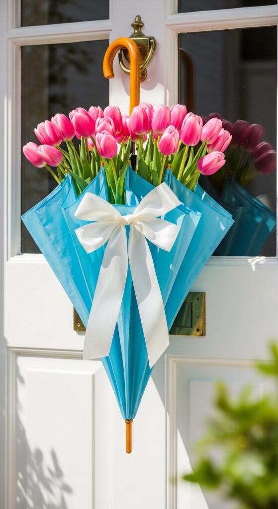 Instead of a traditional round wreath, try using a light-blue or soft pink umbrella as a “hanging vase” for your front door. Half-open the umbrella, secure it with a beautiful silk ribbon, and fill the “pocket” with faux tulips and baby’s breath. This look is a massive trend on Pinterest right now because it’s unexpected and whimsical. It’s a perfect way to signal that “spring showers” have brought beautiful flowers to your doorstep.