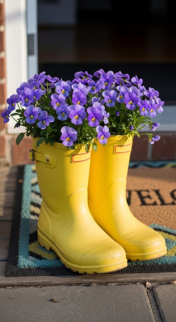 For a touch of whimsy, use a pair of bright yellow or floral-patterned rain boots as vases. Place a heavy stone in the bottom to keep them upright and tuck a container of pansies inside. Set them right by the door as if someone just stepped out of them. It’s a cute, “storytelling” decor piece that brings a smile to everyone who visits.