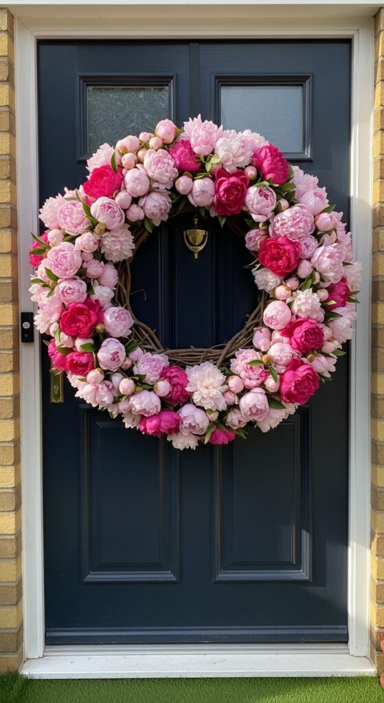 Go big with a massive oversized wreath made of grapevine and filled with high-quality silk peonies in various shades of pink. An oversized wreath makes a small door look grand and a large door look truly spectacular. Ensure the colors coordinate with your house’s trim for a cohesive, high-end look that neighbors will certainly envy.