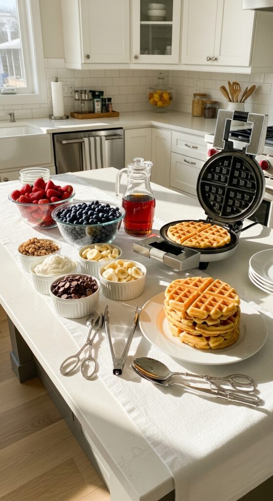 Set up a dedicated station with fluffy Belgian waffles as the centerpiece. Include glass bowls filled with fresh strawberries, blueberries, whipped cream, and maple syrup. This is a visual masterpiece for social media; imagine the vibrant colors of the fruit against the golden waffles. It’s practical because guests can customize their plates to their own dietary preferences.