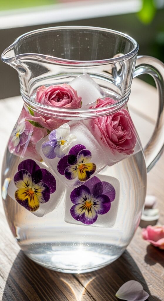 Elevate your water or juice carafes by freezing edible flowers inside large ice cubes. As the ice melts, the flowers float in the drink. It’s a small detail that shows immense effort and adds a high-end “boutique hotel” feel to your brunch.